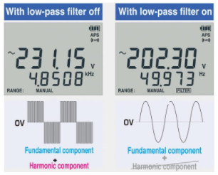 Accurately measure the fundamental wave alone by eliminating harmonic components with the DMM’s low-pass filter function.