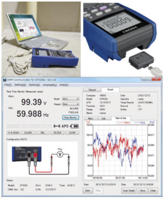 If you connect the DT4253 to a computer with the optional Communication Package DT4900-01, you can graph data stored in the instrument’s internal memory and display measurement results in real time on the computer. In addition, displayed measured values can be saved (in text format). *The computer and multimeter are electrically isolated by means of optical communications so that data can be sent with peace of mind.