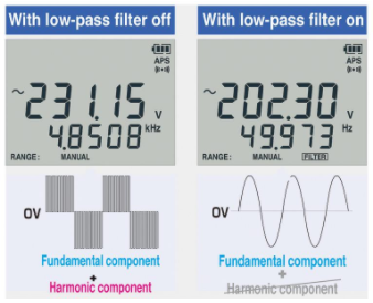 Accurately measure the fundamental wave alone by eliminating harmonic components with the DMM’s low-pass filter function.