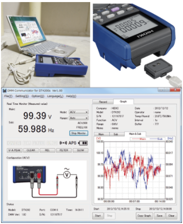 If you connect the DT4254 to a computer with the optional Communication Package DT4900-01, you can graph data stored in the instrument’s internal memory and display measurement results in real time on the computer. In addition, displayed measured values can be saved (in text format). *The computer and multimeter are electrically isolated by means of optical communications so that data can be sent without concern for electrical hazards.