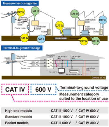 To ensure operators’ ability to use measuring instruments safely, IEC 61010 classifies the locations in which instruments are used into a series of safety-based measurement categories (ranging from CAT II to CAT IV). Using an instrument that does not satisfy the required safety level can lead to an electrical accident.