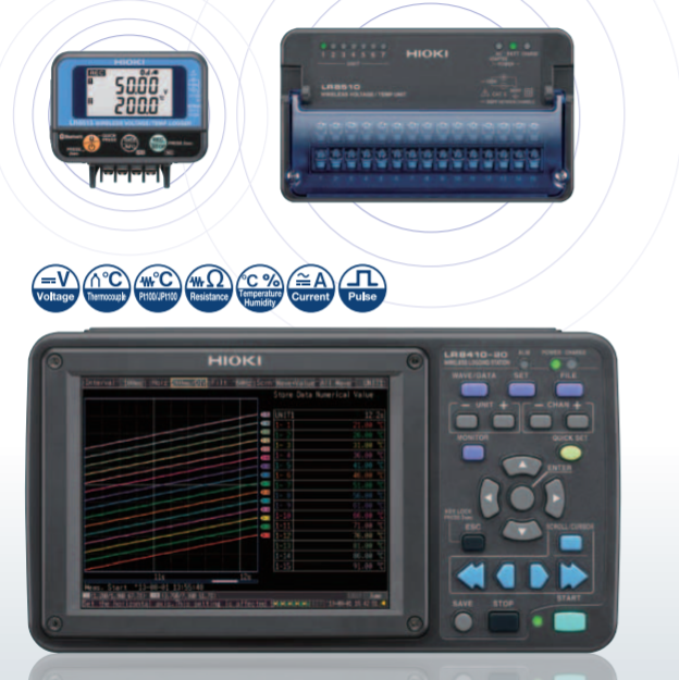 Hioki Memory HiLoggers are high-speed data loggers for recording multiple channels of voltage, temperature, resistance or humidity signals, some models providing complete isolation between channels and strong noise resistance. The LR8410-20 is an innovative wireless logging system capable of capturing up to 105 channels of data wirelessly using Bluetooth® wireless technology.