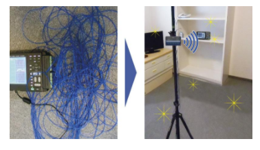With a wired instrument… Recording a large number of channels means you’ll have to deal with a mess of wires. In addition to increasing the cost of connection cables and thermocouples, long wires make setup more time-consuming.