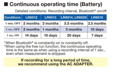 The logger will operate for about 20 days on two AA-size alkaline batteries. (Recording interval: 1 sec, with Bluetooth(R) ON) Since the batteries will last longer the less time the Bluetooth(R) function is operating, the instrument features a power-saving function that automatically turns on the Bluetooth(R) circuit during predefined time periods. While communications are disabled, data is reliably stored in the instrument’s large built-in memory, which can hold 500,000 data points per channel. Use the AC adapter to record data over extended periods of time with peace of mind.