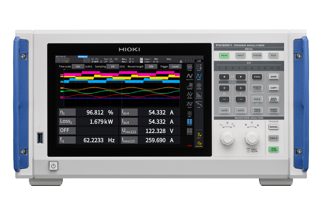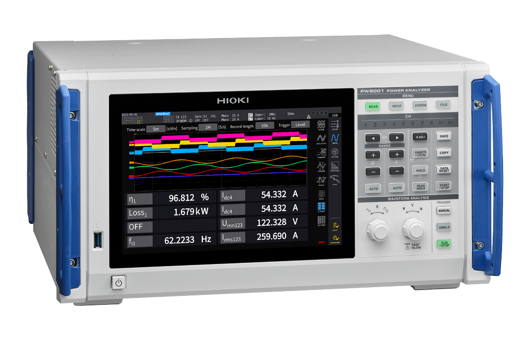 Evaluating power conversion efficiency requires the ability to accurately measure power in every band, from DC to high frequencies. The PW8001 delivers exceptional measurement accuracy not only for 50/60 Hz, but also across a broad frequency band, including for DC and at 50 kHz. This allows it to accurately evaluate power conversion efficiency which often involves measuring multiple frequencies.